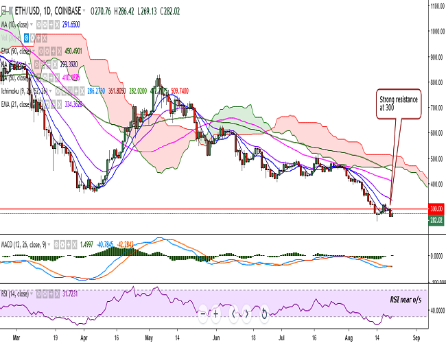 ETH/USD dropped to 268 levels on Monday as it failed to hold above 300.