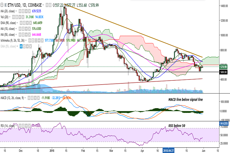 ETH/USD is trading in a close range on Thursday with its upside capped by 10-DMA. It is currently trading at 569 levels at the time of writing (Coinbase).