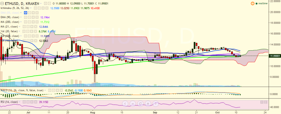 ETH/USD failed to break above 90 EMA, hit a high of 12.23 and closed below 12.00 mark on Tuesday. Today, the pair has hit 12.09 levels so far and is currently trading at 11.94 levels (Kraken).