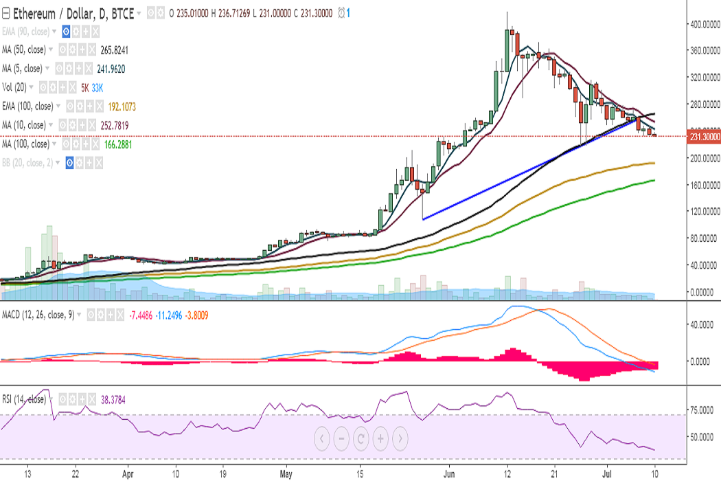 ETH/USD is moving south as it breached cloud top on June 07. It is currently trading at 231 levels at the time of writing (BTC-e).