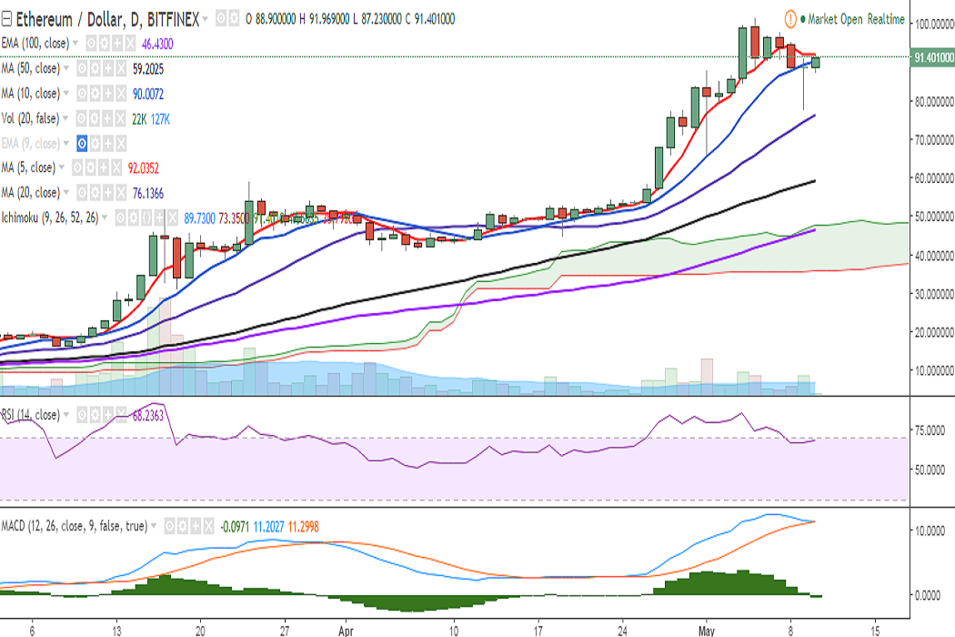 ETH/USD restored its strength to above 90 levels on Wednesday, after it plunged to 77.76 levels on May 09. It is currently trading at 91 levels at press time (Bitfinex).