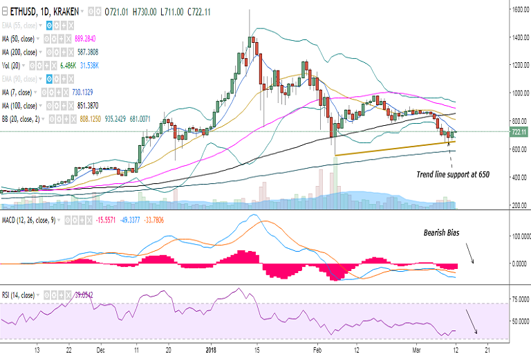 ETH/USD is trading in a narrow range on Monday with its upside capped by 7-DMA. It is currently trading at 723 levels at the time of writing (Kraken).