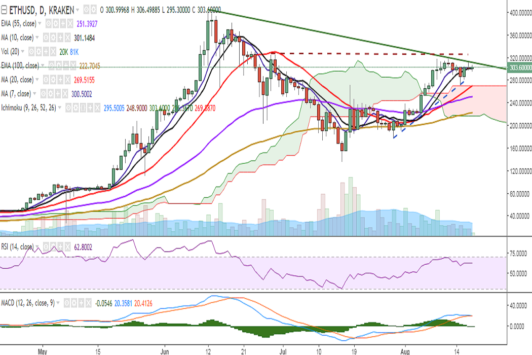 ETH/USD continues rangebound trading on Friday as it faces strong resistance from trend line joining 404.98 and 320. It is currently trading at 303 levels at the time of writing (Kraken).