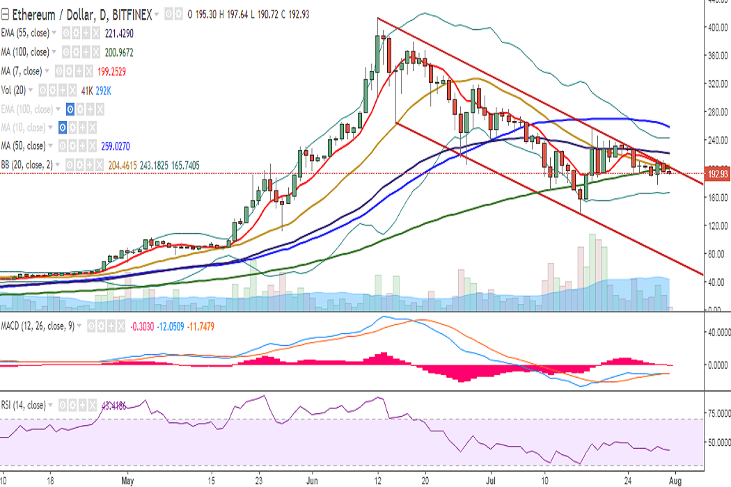 ETH/USD is continuing rangebound trading on Monday and is trading at 193 levels at the time of writing (Bitfinex).