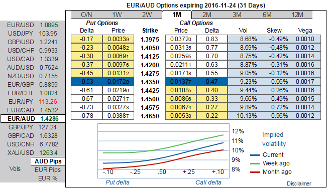 As a resultant effect of fundamental developments as discussed above, the sentiments in OTC market for EURAUD have been fairly balanced on either side, you can probably make out 1m IV skews that signify the importance of the OTM puts which is why we are loading up more weights in options strategy that mitigates downside risks.