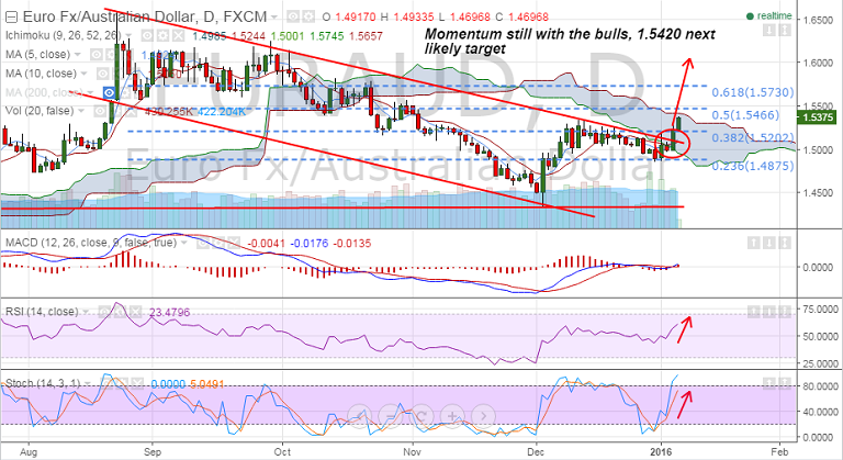 After breaking the channel top at 1.5105 EUR/AUD has broken above 1.52 levels (38.2% Fib of 1.6585 to 1.4347 fall) which was capping the upside on Wednesday.