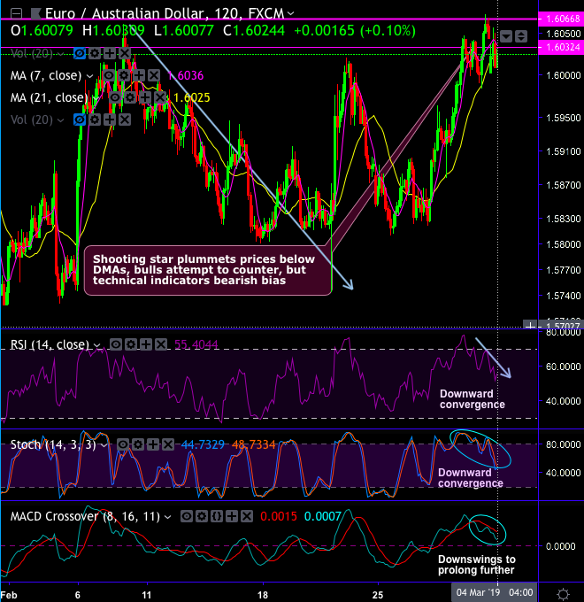Technical Chart and Candlestick Patterns: Please be noted that EURAUD slumps below 7 & 21-DMAs on a back-to-back shooting star and spinning top patterns at stiff resistances of 1.6066 levels (to be precise at 1.6059 and 1.6058 levels respectively, refer 2H chart).