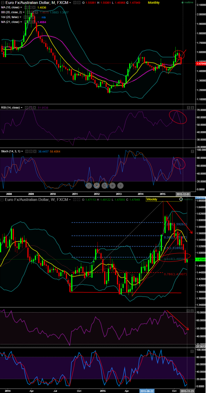 You can also observe the pair on monthly charts, this has broken channel line support earlier at around 1.5506 levels (see circled area) with spot FX at 1.4794 slipping below 10DMA again which is again a bearish sign.