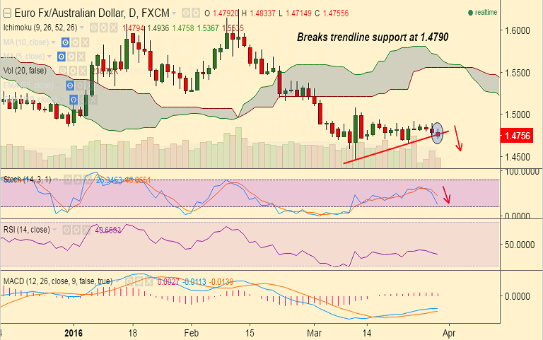 - EUR/AUD has broken major support at 1.4790 and is currently trading at 1.4745 levels.
