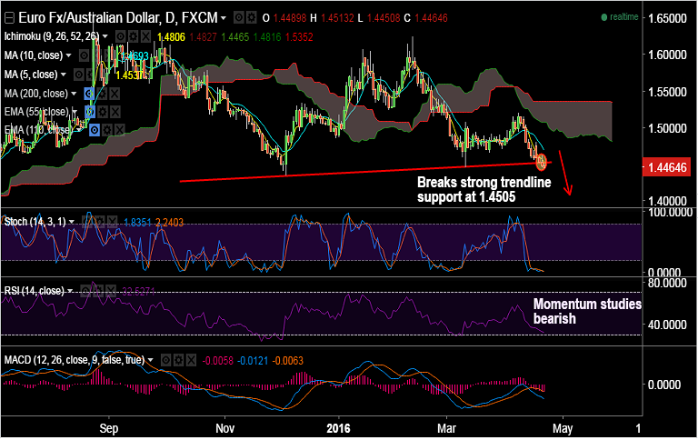 - EUR/AUD extends slump, breaks strong trendline support at 1.4505, bias remains lower.