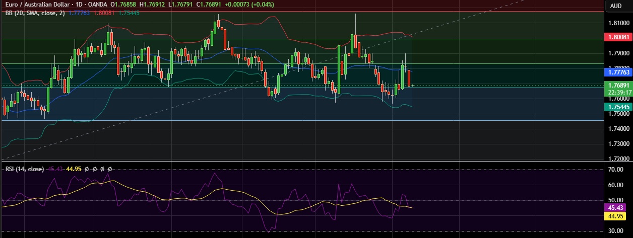 • Support is seen at 1.7672 (61.8 % fib) and break below could take the pair towards 1.7552 (Lower BB).