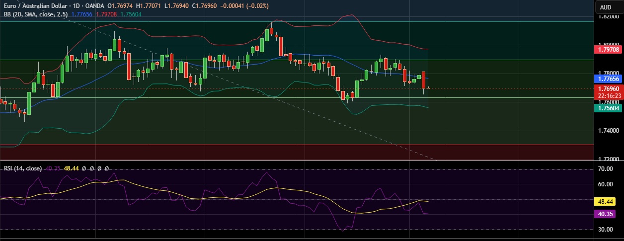 • Support is seen at 1.7628 (38.2% fib) and break below could take the pair towards 1.7569(Lower BB).