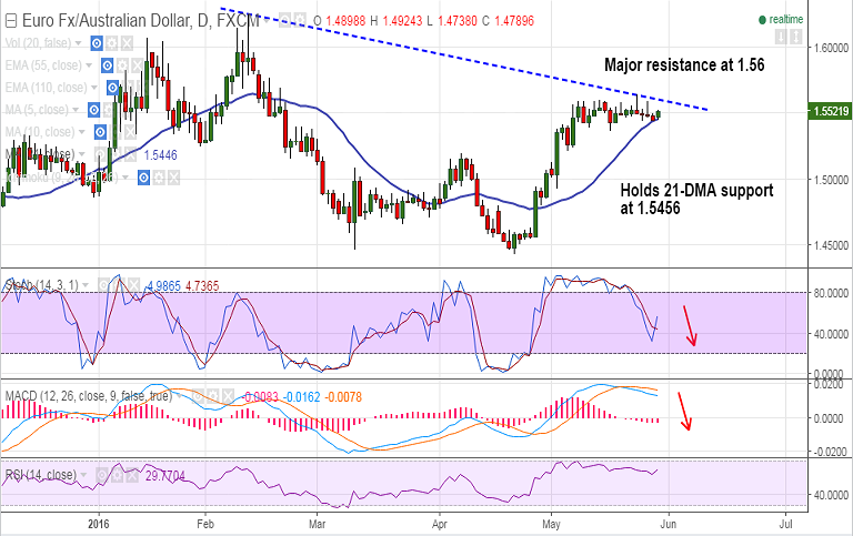 FxWirePro: EUR/AUD holds 21-DMA support at 1.5456, weakness only on break below