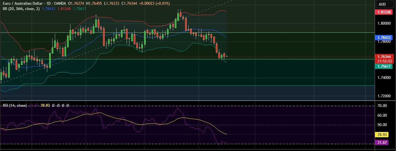 • Strong support is seen at 1.7606(50%fib) and break below could take the pair towards 1.7568(Lower BB).