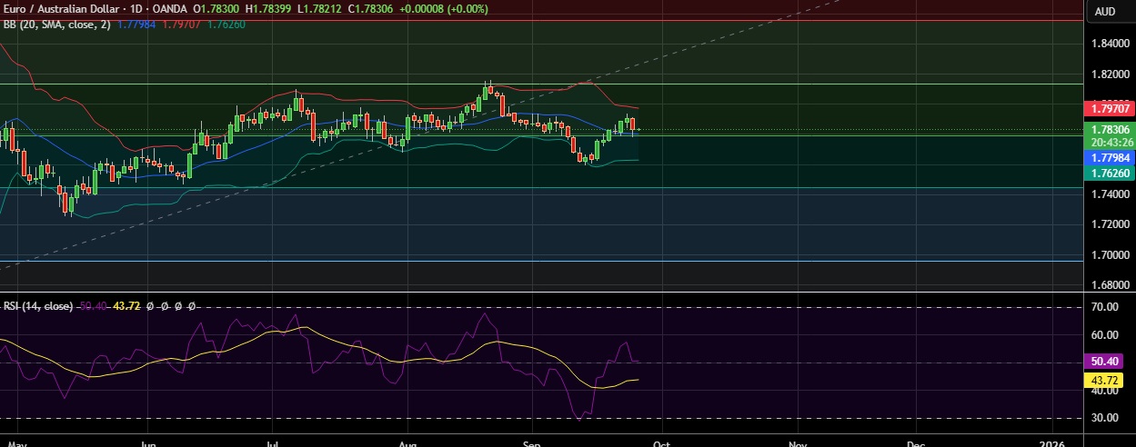 • Strong support is seen at 1.7784(50% fib) and break below could take the pair towards 1.7627(Lower BB).