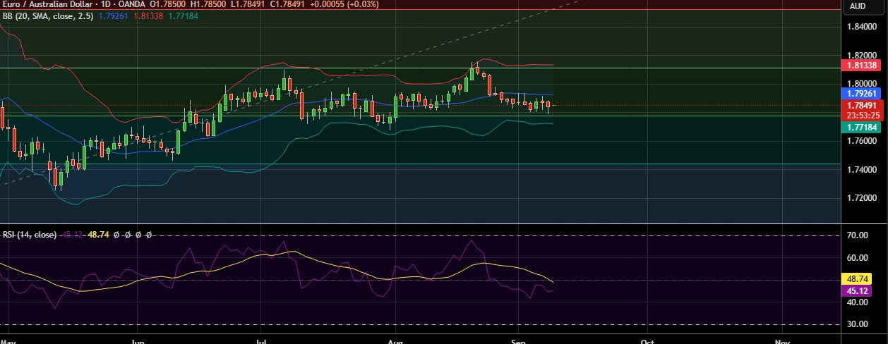 • Strong support is seen at 1.7795 (50% fib) and break below could take the pair towards 1.7725(Lower BB).