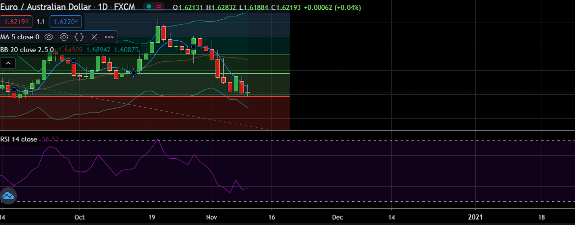 •After the two-day fall, pair has retreated to 1.6222, EUR/AUD may need a break below 23.6% fib to clear assault on 1.6100.