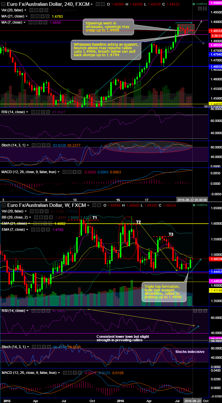 Whipsaws baseline acting as support, any bounce above may resume rallies up to 1.4906; breach below can pull back slumps up to 1.4794.