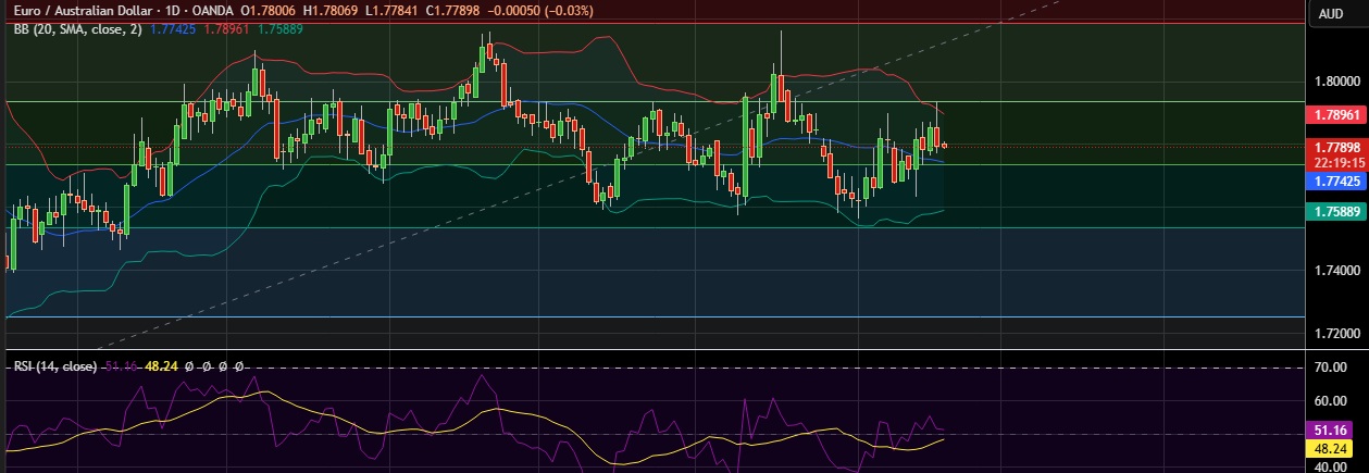 • Support is seen at 1.7741(50%fib) and break below could take the pair towards 1.7590(Lower BB).