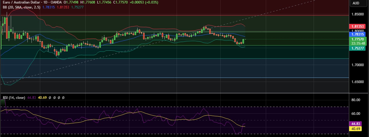 • Immediate support is seen at 1.7578(50% fib) and break below could take the pair towards 1.7527(Lower BB).