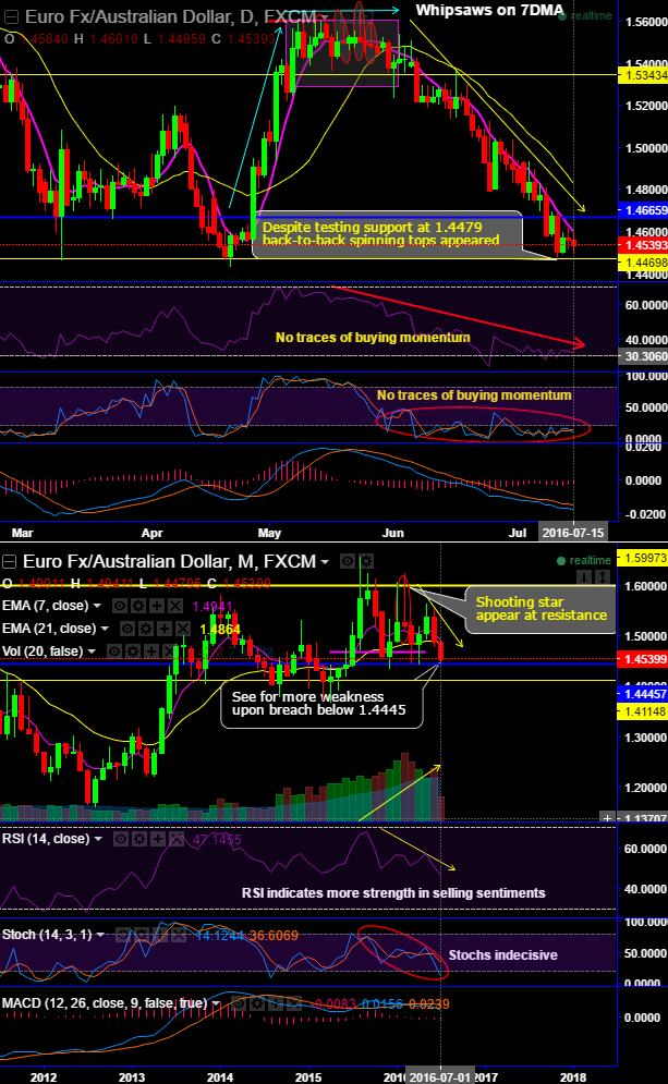 Despite testing support at 1.4479 back-to-back spinning tops appeared (see daily charts).