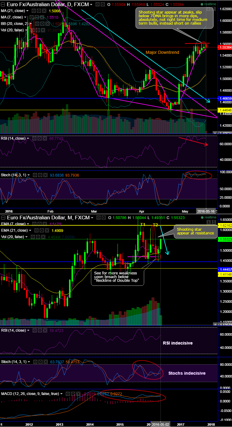 Although the pair has been spiking from last fortnight or so (perhaps, the effects of RBA intervention) , it has tumbled earlier to break below major supports 1st at 1.5496, secondly at 1.5269, thirdly at 1.5060 and now at 1.4855 levels after the formation of this shooting star pattern (see monthly charts), now convincing trend direction from last couple of months.