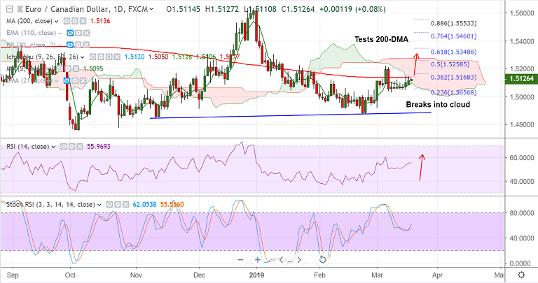 - EUR/CAD breaks into daily cloud, tests 200-DMA resistance, bias higher.