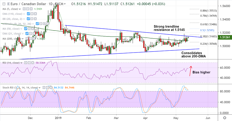 - EUR/CAD consolidates above 200-DMA and remains capped at strong trendline resistance at 1.5145.