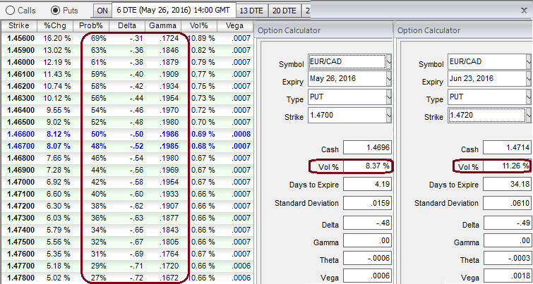 The delta of EURCAD would be at its fastest rate and gets faster as your position come closer to the expiration date. As a result, time decay may have a relevant impact on ATM options.