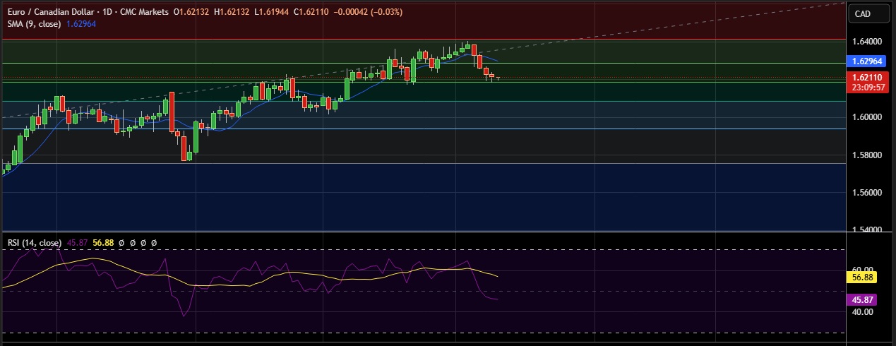 • EUR/CAD eased on Thursday as euro was dragged down by French political unrest and lackluster German data.