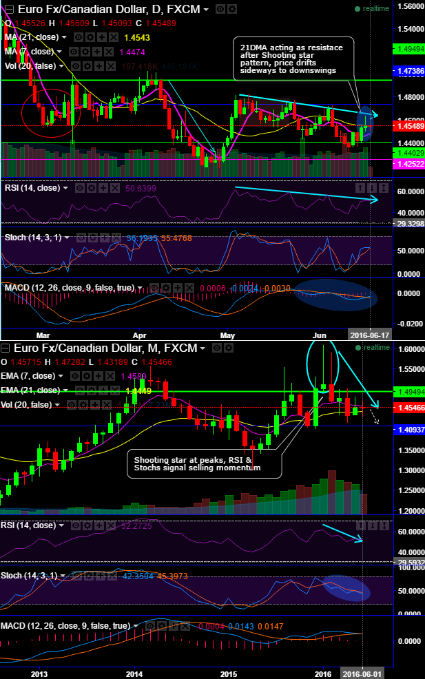 On both monthly and daily charts of EURCAD, we spot out shooting star pattern candles formed to highlight a caution for bulls.