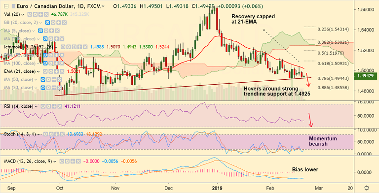 - EUR/CAD is trading at 1.4960 at 0530 GMT, up 018% at the time of writing.
