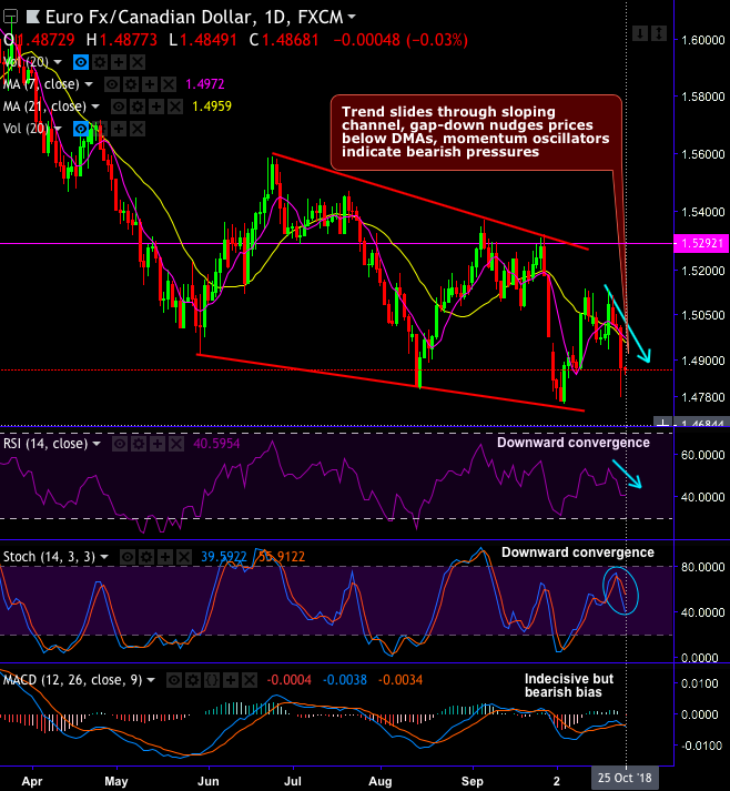 EURCAD bearish candles with big real bodies are signifying the weakness of this pair in the major trend and the minor trend slides through sloping channel, these bearish patterns nudge prices below DMAs, while the bulls bounce back with engulfing pattern.