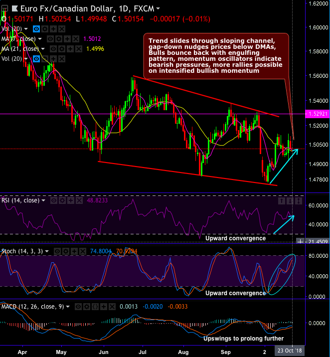 Technically, although EURCAD bearish candles with big real bodies are signifying the weakness of this pair in the major trend and the minor trend slides through sloping channel, gap-down candlestick pattern nudges prices below DMAs, while the bulls bounce back with engulfing pattern, the momentum oscillators indicate bearish pressures, more rallies possible on intensified bullish momentum.