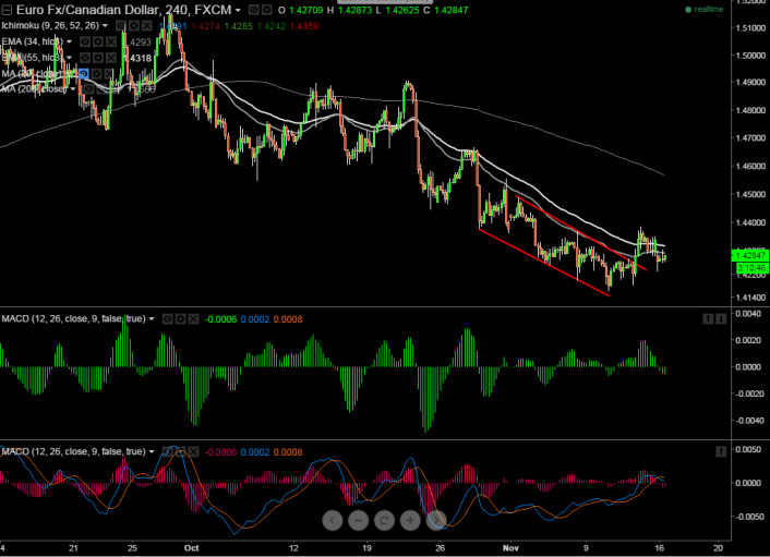 The pair has made a high of 1.4350 and declined till 1.4230 from that level. It is currently trading around 1.4280