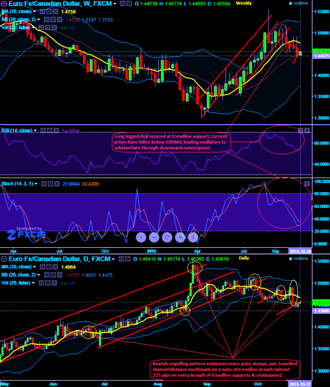 On daily charts of EURCAD, we spot out "Bearish Engulfing" pattern candle formed to emphasize a caution for bulls and active signals for bears. Currently, the pair is testing trendline resistance around 1.4560 levels.