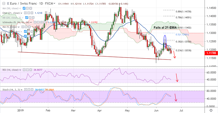 EUR/CHF trades 0.16% lower on the day at 1.1176 at 11:50 GMT, bias bearish.