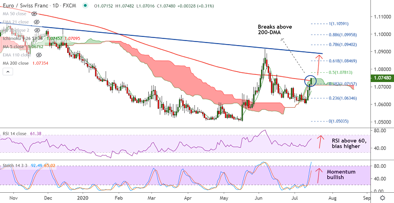 EUR/CHF has broken above 200-DMA resistance to hit 4-week highs at 1.0754, outlook bullish.