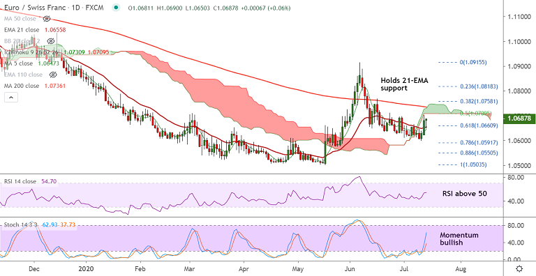 Support levels - 1.0655 (21-EMA), 1.0591 (78.6% Fib)