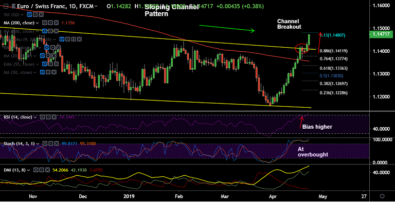 - The pair has broken strong resistance at 1.14 levels, is on track to test 38.2% Fib at 1.1484.