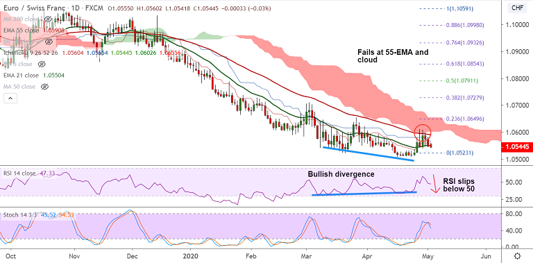 EUR/CHF is set to resumes weakness as recovery attempts in the pair have been rejected at stiff resistance at 55-EMA and daily cloud.