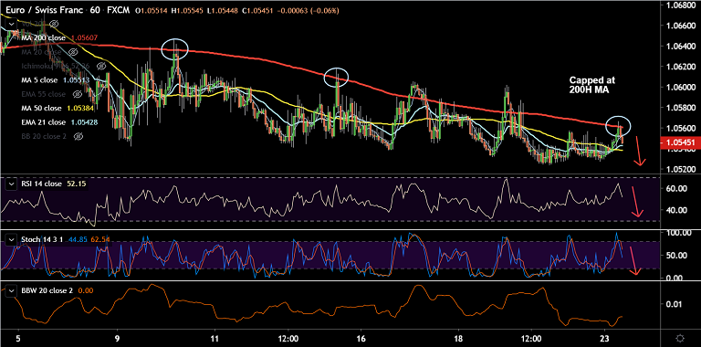 EUR/CHF faces rejection at 200H MA, slips lower from session highs at 1.0567.