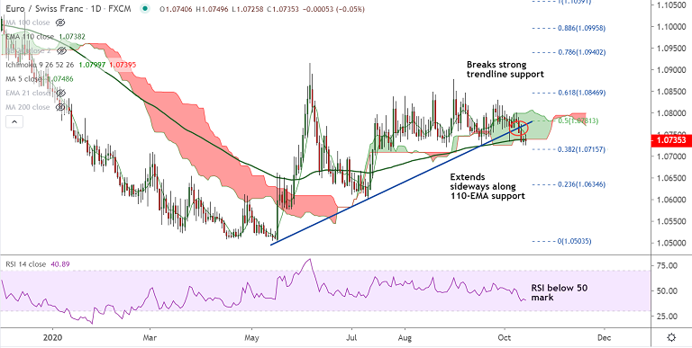 EUR/CHF was extending sideways grind around 110-EMA support, outlook remains bearish.