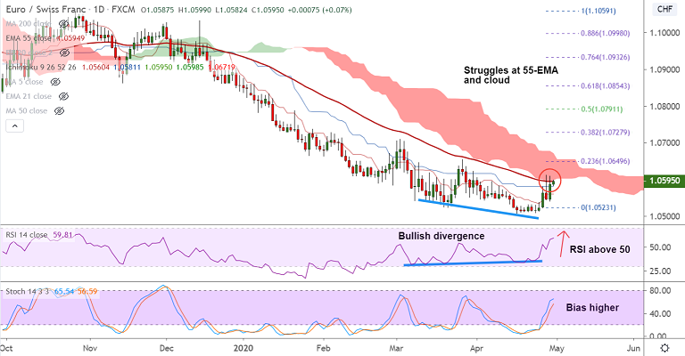 Price action is struggling to break past 1.06 mark which is stiff resistance being converged 55-EMA and daily cloud.