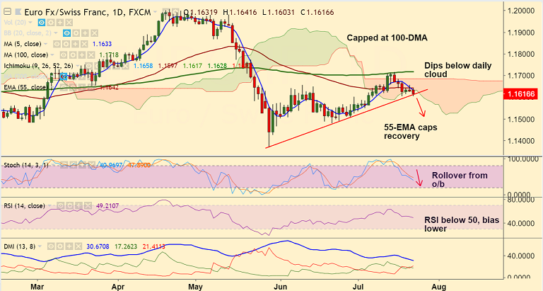 - EUR/CHF recovery capped at 55-EMA, the pair currently trades at 1.1631, down 0.10% on the day.