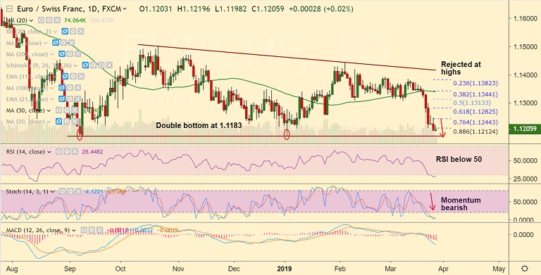 - EUR/CHF rejected at session highs at 1.1219, slips lower to currently trade at 1.1203 at 0935 GMT.