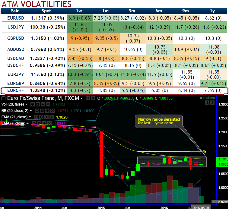 At current spot at 1.0928, the pair has been oscillating between the range of 1.1199 on north and 1.0732 on the south. While OTC markets also predict the choppy range to prolong further as you can probably make out from the lower IVs of ATM contracts over various tenors, 4.3% and 4.85 for 1W and 1m expiries respectively (the least among G20 currency space). While 25-delta risk of reversals of EURCHF have been neutral with the no significant hedging sentiments.