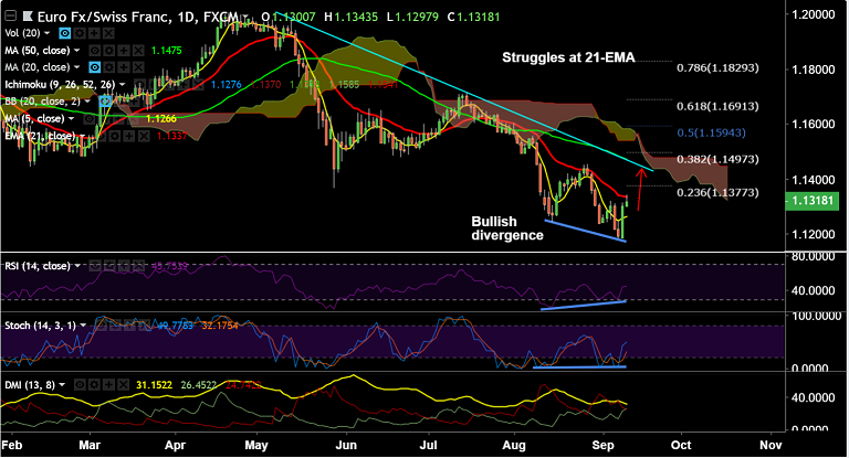 - EUR/CHF edges lower from session highs at 1.1343, finds stiff resistance at 21-EMA.