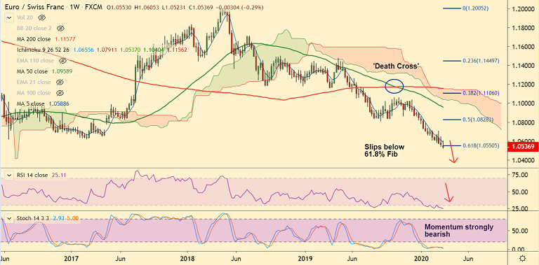 EUR/CHF grinds lower, slips below 61.8% Fib (1.0550), scope for further weakness.