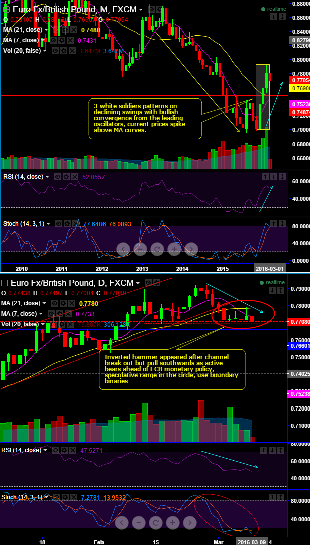 Inverted hammer occurred at 0.7729 after channel break out to pull southwards as active bears ahead of ECB monetary policy, speculative range in the circle, use below boundary binary option strategy for speculation.